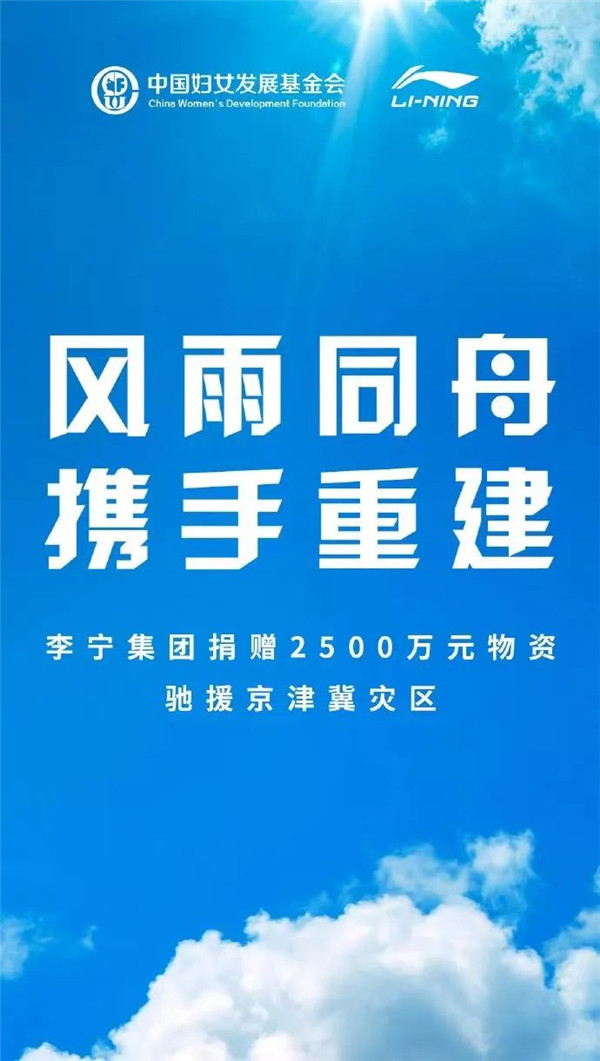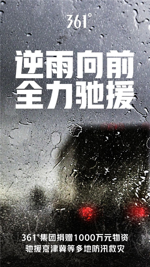 “風(fēng)雨同舟,攜手重建”,中國(guó)服裝協(xié)會(huì)理事單位——李寧集團(tuán)通過(guò)中國(guó)婦女發(fā)展基金會(huì)捐贈(zèng)2500萬(wàn)元物資,用于支持京津冀抗汛救援及災(zāi)后重建工作。 “逆雨向前,全力馳援”,中國(guó)服裝協(xié)會(huì)理事單位——三六一度集團(tuán)向中國(guó)青少年發(fā)展基金會(huì)捐贈(zèng)1000萬(wàn)元物資馳援京津冀閩等多地災(zāi)區(qū),為一線(xiàn)防汛救災(zāi)工作盡一份力。