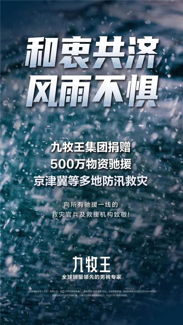 “和衷共濟(jì),風(fēng)雨不懼”,中國(guó)服裝協(xié)會(huì)副會(huì)長(zhǎng)單位——九牧王股份有限公司攜旗下品牌九牧王男褲專(zhuān)家、FUN、ZIOZIA緊急捐贈(zèng)物資500萬(wàn)元,馳援防汛救災(zāi),用于保障京津冀及泉州等受災(zāi)地區(qū)的人員安全、應(yīng)急救援和災(zāi)后重建等工作。
