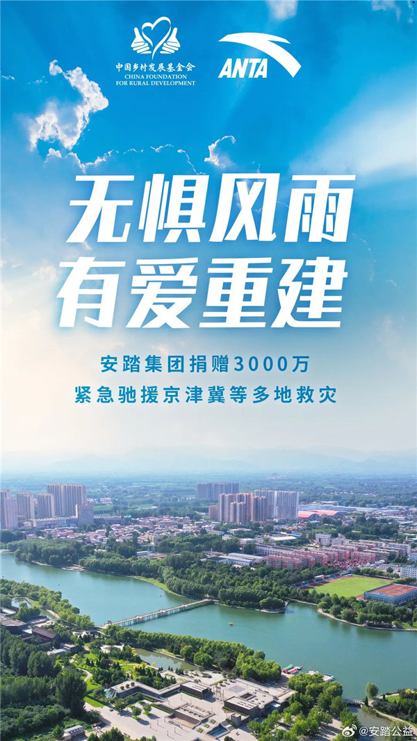 連日來(lái),受臺(tái)風(fēng)“杜蘇芮”影響,京津冀多地遭遇持續(xù)強(qiáng)降雨,由此引發(fā)的災(zāi)情及后續(xù)應(yīng)急救援工作備受關(guān)注。在一些救災(zāi)組織積極響應(yīng)投入一線(xiàn)救災(zāi)的同時(shí),多家服裝企業(yè)及電商平臺(tái)相關(guān)企業(yè)也第一時(shí)間以不同方式參與到救援當(dāng)中。 “無(wú)懼風(fēng)雨,有愛(ài)重建”,安踏集團(tuán)向中國(guó)鄉(xiāng)村發(fā)展基金會(huì)緊急捐贈(zèng)3000萬(wàn)元,包括2000萬(wàn)元物資及1000萬(wàn)元現(xiàn)金,用于響應(yīng)京津冀及福建泉州受災(zāi)地區(qū)的災(zāi)情救助需求,保障受災(zāi)群眾人身安全和過(guò)渡安置,采購(gòu)緊急救災(zāi)物資和救援設(shè)備,并幫助地區(qū)災(zāi)后重建與復(fù)工復(fù)產(chǎn)。