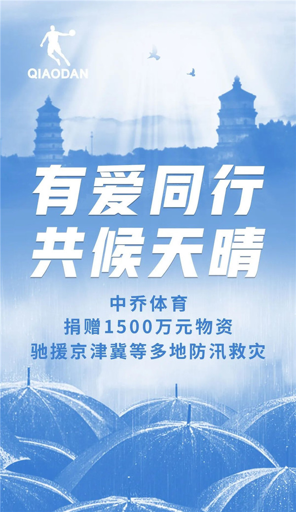 “有愛(ài)同行,共候天晴”,中喬體育捐贈(zèng)1500萬(wàn)元物資前往京津冀等多地,幫助災(zāi)區(qū)渡過(guò)難關(guān)。