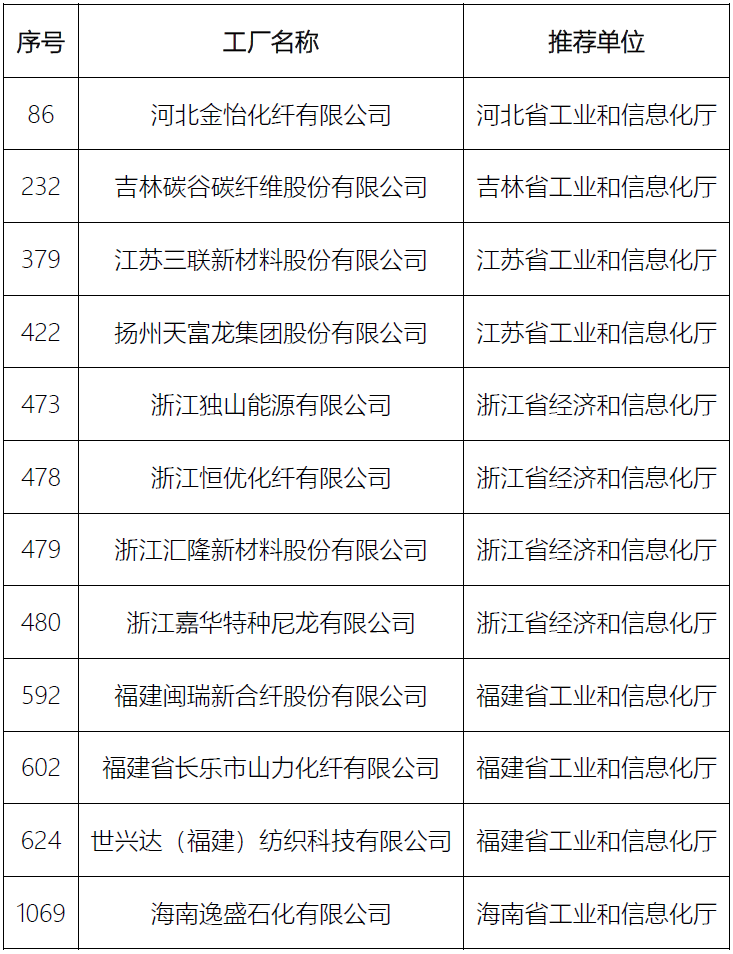 工信部按照《綠色工廠梯度培育及管理暫行辦法》(以下簡稱《管理辦法》)有關(guān)要求,經(jīng)申報(bào)單位自愿申報(bào)、省級工業(yè)和信息化主管部門推薦及專家評審、公示等程序,確定了2024年度綠色制造名單。1月23日,工業(yè)和信息化部網(wǎng)站公布了 2024 年度綠色制造名單。在2024年度新培育出的 1382 家國家層面綠色工廠、123 家綠色工業(yè)園區(qū)以及 126 家綠色供應(yīng)鏈管理企業(yè)中,有12家化纖相關(guān)企業(yè)入選綠色工廠名單。