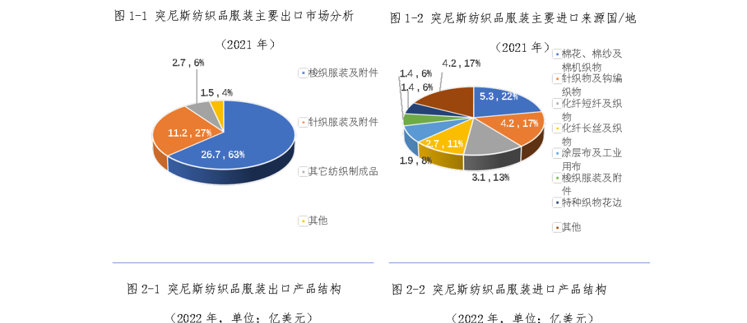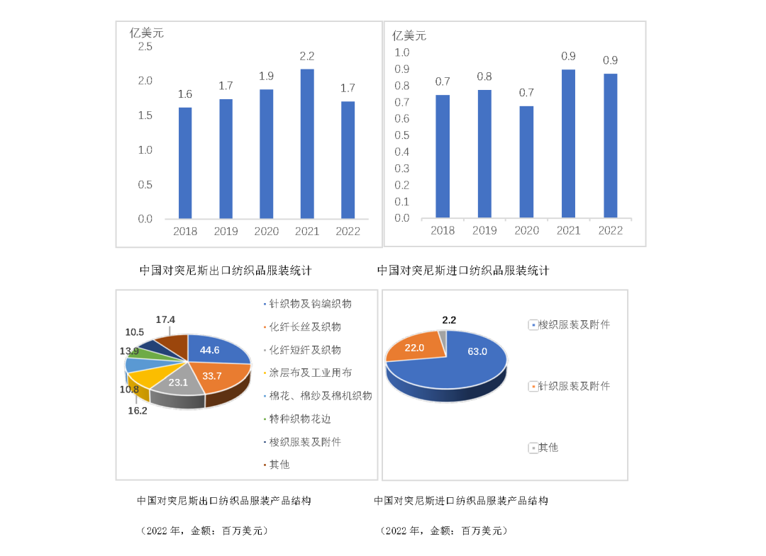 2022年,中國對突尼斯出口紡織品服裝1.7億美元,主要出口產品包括針織面料(占比26.2%)、化學纖維紗線及面料(化纖短纖及長絲紗線、織物合計占比33.3%)等。同期,中國自突尼斯進口紡織品服裝8712萬美元,主要進口產品為針梭織服裝及衣著附件,占比超過97.5%。