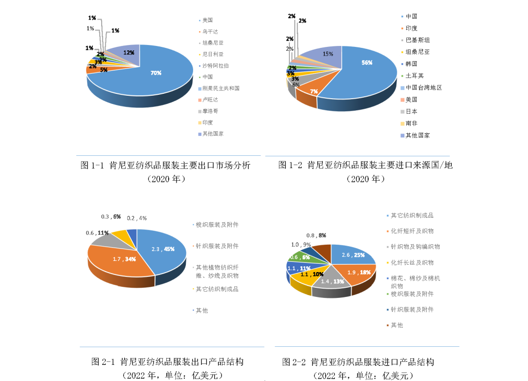 據聯合國國際貿易中心(ITC)數據,2020年肯尼亞紡織行業主要產品70%以上出口至美國市場,其余銷往烏干達、坦桑尼亞等非洲其他國家。中國則是肯尼亞最大的紡織品服裝進口來源地,在進口總額中占比達到56.5%。
