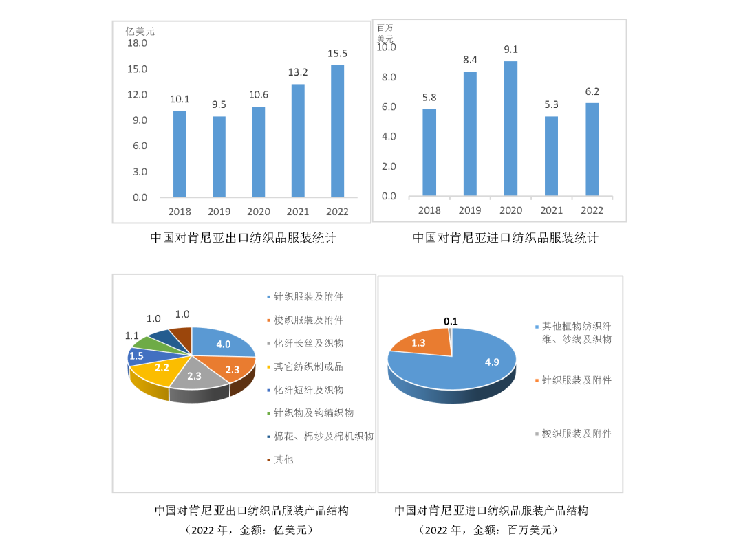得益于共建“一帶一路”合作,中國與肯尼亞雙邊貿易發展迅速。中國是肯尼亞第一大貿易伙伴和主要外國直接投資來源國,肯尼亞也是吸引中國投資最多的非洲國家之一。2022年1月,肯尼亞同中國簽署了一系列雙邊協定,進一步促進雙邊貿易發展。中國海關統計數據顯示,近年來,中國對肯尼亞紡織品服裝出口額保持穩步增長,2022年出口額達15.5億美元,進口額約624萬美元,主要出口產品包括針織服裝及衣著附件(占比25.7%)、梭織服裝及附件(占比14.9%)、化纖紗線及面料(占比24.7%)等;主要進口產品為麻纖維、紗線及織物,占比高達77.9%。