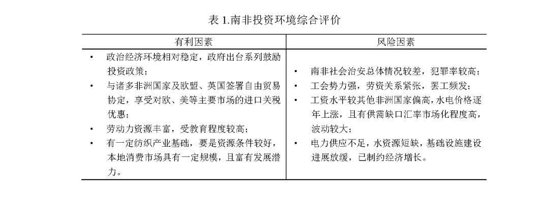 (1)南非作為撒哈拉以南的主要經濟體,與中國建立了長期友好合作關系,是第一個同中國簽署共建“一帶一路”合作文件的非洲國家,也是中國在非洲投資存量最多的國家之一,因其工業基礎良好、硬件基礎設施相對完備、海運便利,對外貿易與投資優惠政策具有吸引力,紡織服裝業成為其吸引外資的重點行業。