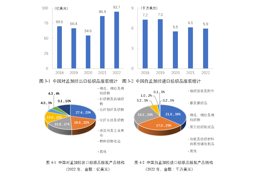 貿易合作方面,中國為孟加拉國提供各種紡織面料用于其服裝加工和出口,孟加拉國則為中國提供部分服裝產品及棉花和黃麻原料。根據中國海關統計,2022年,中國與孟加拉國紡織品服裝進出口總額為94.3億美元,其中中國對孟出口額為93.7億美元,自孟進口額為5900萬美元。中國對孟主要出口產品為棉花、棉紗及棉機織物(占比29%),針織物及鉤編織物(占比20%),化纖短纖及織物(占比17%),化纖長絲及織物(占比15%)。中自孟主要進口產品為梭織服裝(占比36%),麻及麻織品(占比29%),棉花、棉紗及棉機織物(占比28%)。