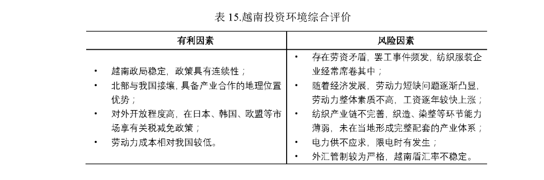 (3)近年來,越南勞動力成本上漲較快,罷工事件時有發生,環保要求較高,我國紡織企業應全面做好成本核算,充分考慮勞資糾紛、環保、限電等風險因素。