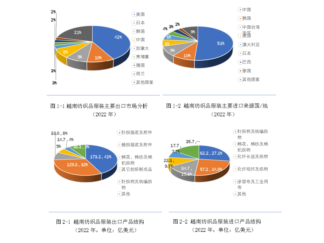目前,越南是世界第二大紡織品服裝出口國(僅次于中國),第三大服裝出口國(僅次于中國、孟加拉),出口產品以服裝為主,進口以纖維原料、紗線及面料為主。根據聯合國數據,2022年,越南紡織品服裝(海關HS編碼50~63章紡織原料、紡織品及服裝)出口額為409.4億美元,主要出口市場是美國、日本、韓國、中國,其中對美國出口額占出口總額的42%。服裝是主要出口產品,占紡織品服裝出口總額的74%,其中針織服裝占比高達42%。同期,越南紡織品服裝進口額為229.9億美元,中國是越南第一大進口來源地,約占進口總額的51%,其次為韓國、中國臺灣地區、澳大利亞等。主要進口產品為針織物及鉤編織物(占比27.1%),棉花、棉紗及棉機織物(占比24.9%),化纖長絲及織物(占比15.1%),化纖短纖及織物(占比9.7%)。