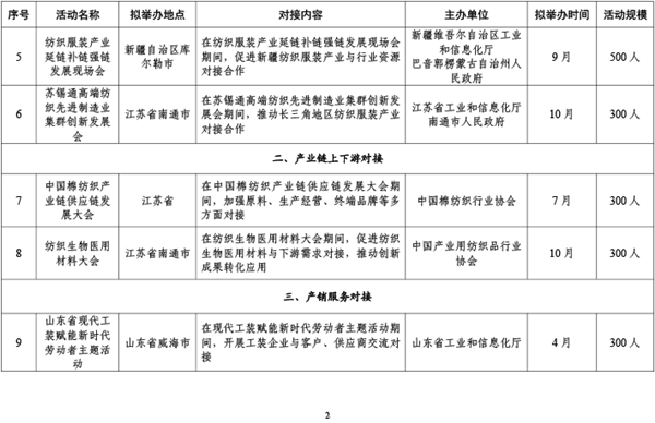 ?。ㄒ唬┘訌姰a業鏈對接。在春季/秋季聯展期間,推動纖維企業、面料企業交流對接,支持纖維新材料應用,促進新產品開發。在行業活動期間,推動生產加工企業、品牌商開展合作,提升品牌競爭力。重點強化棉紡織等行業原料供應保障和品牌建設,促進紡織生物醫用材料與下游企業對接合作。