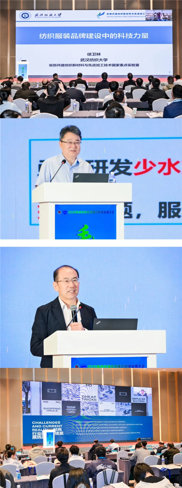 武漢紡織大學(xué)徐衛(wèi)林院士、東華大學(xué)毛志平教授、青島大學(xué)房寬峻教授、路易斯安那大學(xué)劉傳蘭教授分別為大會(huì)作了精彩主旨報(bào)告。徐衛(wèi)林的線上報(bào)告以“科技力量在紡織服裝品牌建設(shè)中的作用”為核心,從纖維材料創(chuàng)新、紡紗技術(shù)革新、織物后整理與標(biāo)準(zhǔn)檢測(cè)三個(gè)維度展開,指出科技創(chuàng)新是提升品牌核心競(jìng)爭(zhēng)力的關(guān)鍵要素。并結(jié)合國內(nèi)外典型案例,分析了科技創(chuàng)新推動(dòng)品牌價(jià)值提升的路徑,強(qiáng)調(diào)我國制造企業(yè)需深化產(chǎn)學(xué)研協(xié)同創(chuàng)新,將科技研發(fā)成果轉(zhuǎn)化為品牌差異化優(yōu)勢(shì),為提升中國紡織服裝行業(yè)的國際影響力注入新動(dòng)能。毛志平圍繞聚酯纖維筒子紗超臨界CO2無水染色技術(shù),分享了其團(tuán)隊(duì)在ScCO2流體染色三大關(guān)鍵問題:染料溶解行為調(diào)控方法,高效率上染工藝、染色成套裝備等方面取得的研究成果,并介紹了其工程化生產(chǎn)產(chǎn)品質(zhì)量與節(jié)能減排效果,從源頭上解決印染行業(yè)的淡水資源消耗和廢水排放問題。房寬峻介紹了開發(fā)的活性染料無鹽連續(xù)軋染和濕態(tài)高速噴墨印花技術(shù),通過對(duì)染整過程中分子作用機(jī)制的研究,為開發(fā)原創(chuàng)性印染技術(shù)指出了新思路。劉傳蘭針對(duì)當(dāng)前紡織行業(yè)面臨的綠色挑戰(zhàn),借助學(xué)術(shù)研究與實(shí)際案例闡述了數(shù)字化技術(shù)對(duì)時(shí)尚行業(yè)可持續(xù)發(fā)展的推動(dòng)作用,呼吁我國紡織行業(yè)應(yīng)緊抓機(jī)遇,引領(lǐng)全球可持續(xù)時(shí)尚轉(zhuǎn)型。