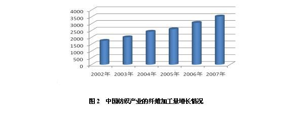 2007年全球纖維消費總量約7 840萬t。中國紡織產業的纖維加工量3 530萬t,占全球纖維消費45%。2002年以來,中國纖維加工量以15%的速度遞增(圖2)。毫無疑問,中國是世界紡織服裝供應鏈中最重要的制造中心。