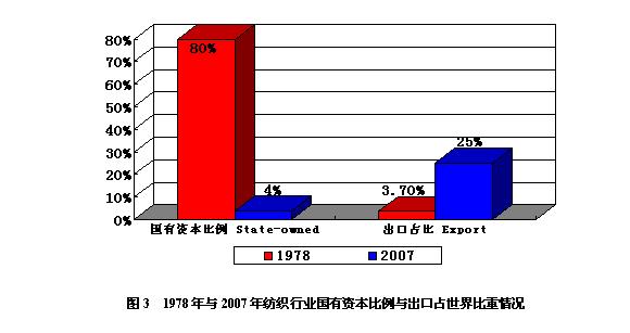 在產業資本結構方面,中國紡織服裝業正向多元化方向發展。1980年紡織服裝業中,國有資本占80%以上(圖3),而現在海外資本、外資企業占中國紡織服裝業近1/4,出口占40%以上,民營資本占據主導地位。據海關統計,2008年一季度,紡織三資企業出口129億美元,占全國紡織出口的34.4%。
