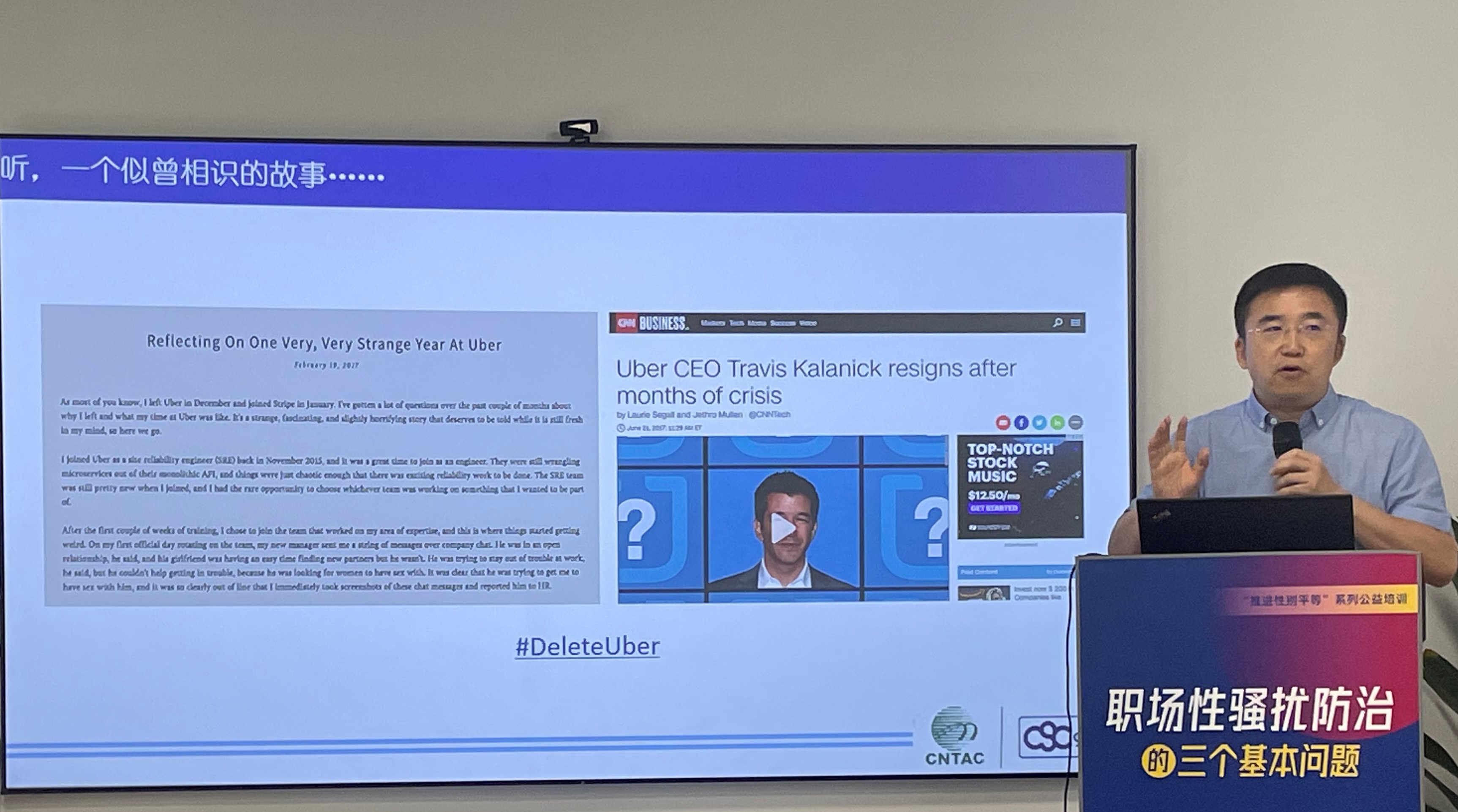 梁曉暉博士以一幅極具幽默色彩的職場性騷擾場景插畫開場,帶領(lǐng)大家認(rèn)識(shí)與了解職場性騷擾的基本概念,分析了職場性騷擾施受雙方的心理狀態(tài)與感受;并從國際規(guī)則與他國數(shù)據(jù)的羅列,到中國性騷擾立法的演進(jìn),為大家層層剝開職場性騷擾頻發(fā)的本質(zhì)原因——性別不平等。就此,他建議企業(yè)應(yīng)發(fā)揮高層領(lǐng)導(dǎo)者作用,旗幟鮮明地倡導(dǎo)性別平等,警惕可能造成性騷擾風(fēng)險(xiǎn)的“尊重失控”場景,并采取積極措施促進(jìn)實(shí)質(zhì)的性別平等。