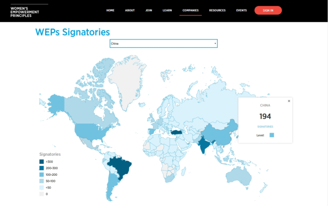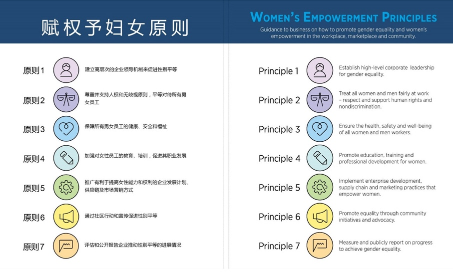 “賦權予婦女原則”(WEPs)是由聯合國婦女署與聯合國全球契約組織共同發起的行動倡議,它包含7條原則,指導企業在工作場所、市場和社區中推動性別平等。迄今為止,全球范圍內,包括阿爾卡特朗訊、宜家、微軟和聯合利華等4400多家公司和智聯招聘、等190多家中國企業都已簽署并承諾采取行動來踐行WEPs。