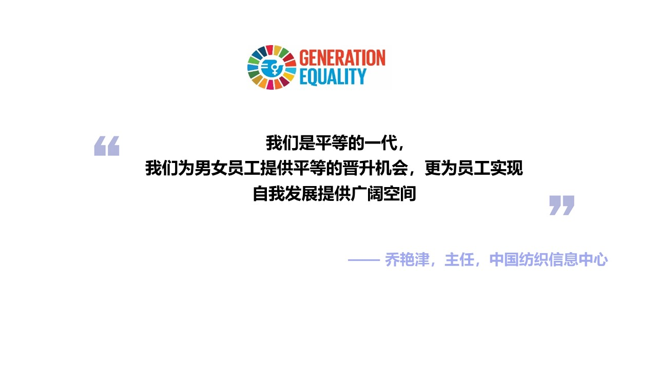 2020年,中紡聯參與聯合國婦女署WE Empower Asia項目,在行業內大力推廣《賦權予婦女原則(WEPs)》,截至2020年12月,包括中國紡織信息中心在內的91家行業企業簽署了《賦權予婦女原則首席執行官聲明》,承諾在企業層面落實“賦權予婦女原則”,以促進工作場所、市場和社區中的性別平等。