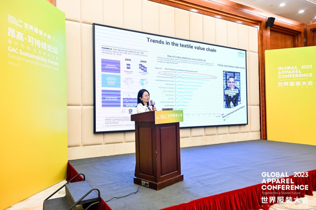 聯合國環境規劃署駐華代表處項目規劃主任王茜在《紡織價值鏈的可持續性和循環性--全球路線圖》的分享中表示,紡織服裝產業的消費群體、消費市場、銷售模式都在發生變化,為應對這些變化、推動全球可持續性和循環性發展,聯合國環境署推出了全球路線圖的三大目標,一是擴展循環商業模式,從中獲取更多的行業收入;二是促進可循環消費,消除鼓勵過度消費的信息;三是在整個價值鏈當中降低整體化學品的使用。此外,聯合國還甄別出了四大關鍵利益相關方和九個基礎的板塊。她強調,實現循環經濟需要相關方通力合作,從設計做起,共同推動行業綠色轉型。