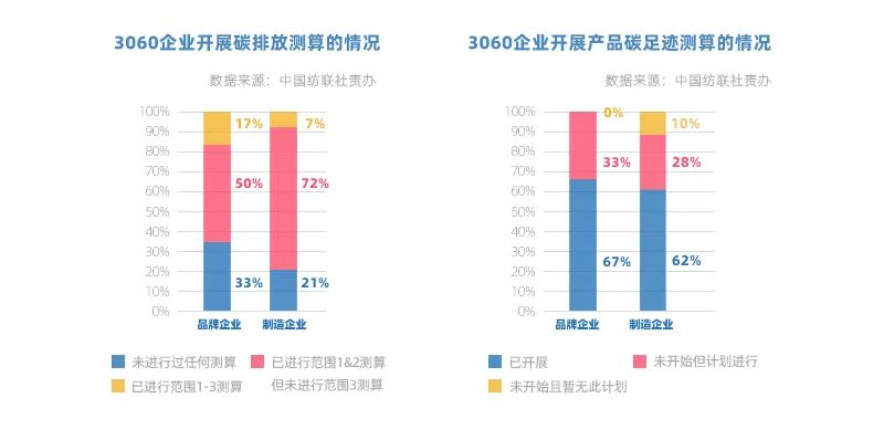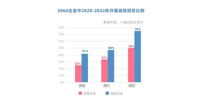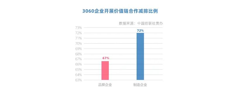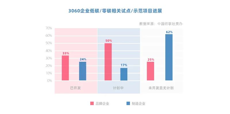 隨著國家推動并建立綠色低碳相關(guān)工廠與產(chǎn)品等評價方法,紡織企業(yè)積極響應,錨定產(chǎn)業(yè)轉(zhuǎn)型新機遇,3060企業(yè)已有27%完成開發(fā)低碳/零碳相關(guān)試點/示范項目。