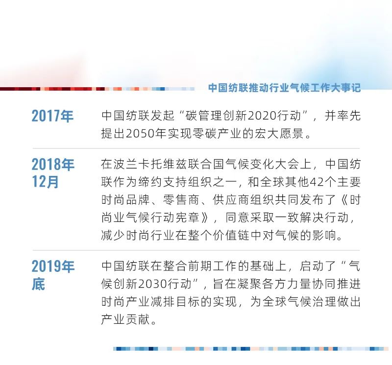 2020年9月22日中國宣布2030碳達峰2060碳中和戰(zhàn)略目標,次日中國紡織工業(yè)聯(lián)合會秋季聯(lián)展全面推進氣候創(chuàng)新行動,第一時間響應國家雙碳戰(zhàn)略目標。2021年6月1日中國紡織工業(yè)聯(lián)合會正式啟動了“中國時尚品牌氣候創(chuàng)新碳中和加速計劃”,簡稱“30·60碳中和加速計劃”,目前21家品牌企業(yè),42家制造企業(yè)陸續(xù)加入,支持綠色低碳技術(shù)研發(fā)推廣和應用,全面推進可信低碳產(chǎn)品、支持可持續(xù)消費,共同推進行業(yè)氣候行動。