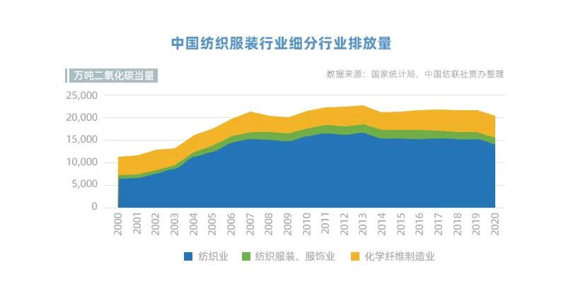 中國紡織服裝行業(yè)溫室氣體排放自2000年起隨著行業(yè)快速發(fā)展逐步上升,而后進入平穩(wěn)期。2014年-2020年溫室氣體排放年均增速均低于0.5%。根據(jù)行業(yè)能源消費數(shù)據(jù)計算,2020年整個行業(yè)碳排放總量約為2.09億噸。從排放來源看,中國紡織服裝行業(yè)排放主要來自上游的材料制造加工端(包括紡織業(yè)和化學纖維制造業(yè)),紡織服裝、服飾業(yè)占比低于10%。
