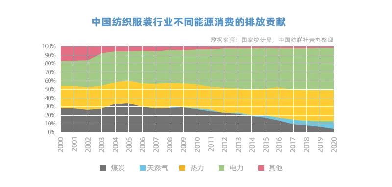 從能源結(jié)構(gòu)來看,中國紡織服裝行業(yè)不斷優(yōu)化能源結(jié)構(gòu),推進行業(yè)能源使用的低碳轉(zhuǎn)型。中國紡織服裝行業(yè)排放絕大部分來自能源使用(主要是電力和蒸汽),到2020年,“煤改氣”“煤改電”取得顯著進展,行業(yè)煤炭消耗占比從30%顯著下降至低于10%,電氣化程度不斷提高。