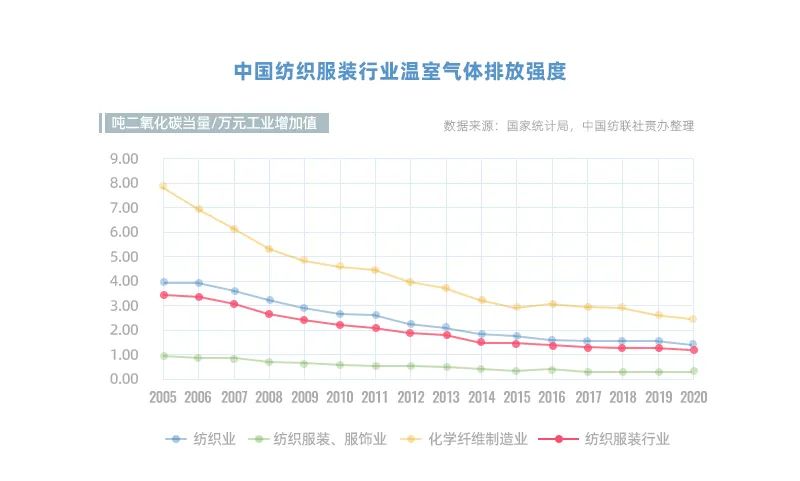 02 行業(yè)氣候行動進展 中國紡織服裝行業(yè)年排放量大約在2.3億噸左右,2020年排放總量約為2.09億噸。行業(yè)排放量約占全國排放量的2%,占全國工業(yè)排放量的2.8%,因此與其他行業(yè)相比,紡織服裝行業(yè)整體排放水平不高。而根據(jù)國際能源署統(tǒng)計,2019年全球紡織和皮革業(yè)排放在2.99億噸左右,占全球排放量的0.6%,因此,中國作為全球紡織服裝產(chǎn)業(yè)和消費大國,中國紡織服裝行業(yè)肩負重大使命,其氣候行動和進展將極大推動全球時尚行業(yè)綠色轉(zhuǎn)型。