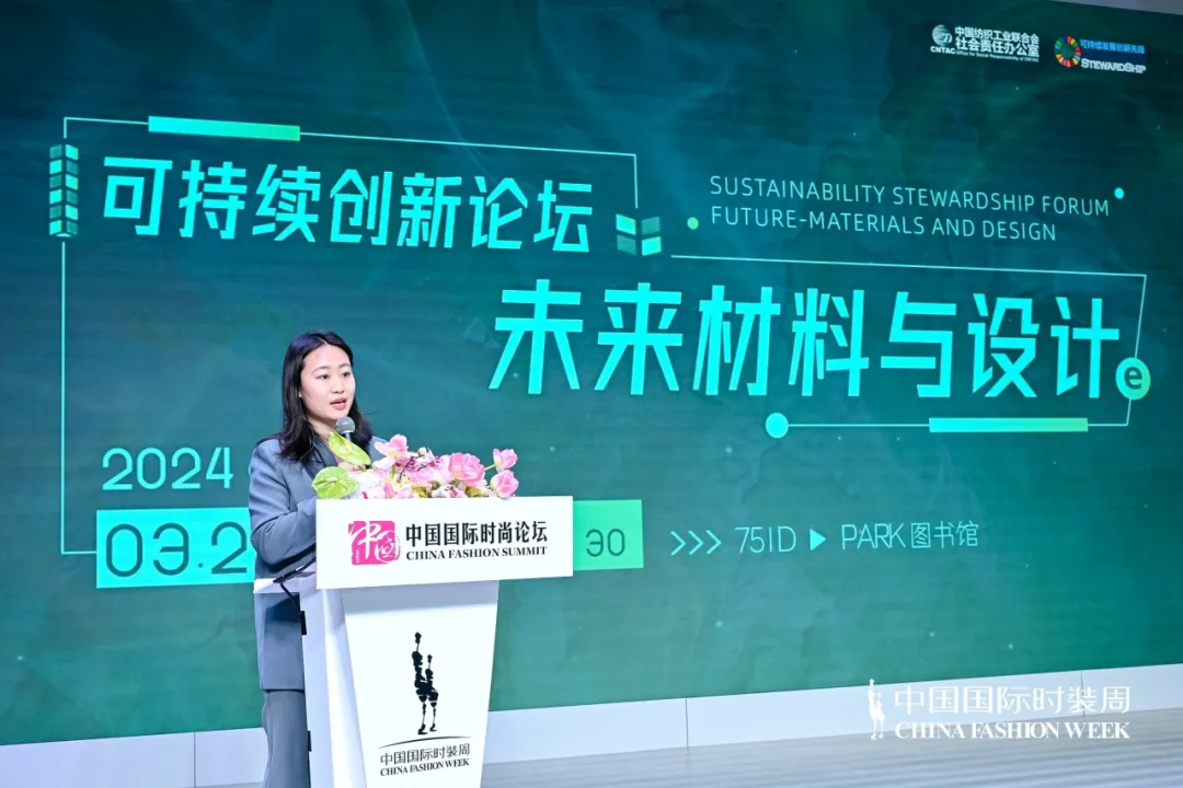 在論壇上,中國紡織工業聯合會社會責任辦公室副主任胡柯華重點解讀了《時尚的科學幻想:可持續未來材料》預覽版報告。該報告由中國紡織工業聯合會發起,歷經三年打磨,于2024年3月在上海發布。值此中國國際時裝周之際,胡主任特別向與會者介紹了該報告的主要內容和愿景。胡主任指出:“時尚和科學離得最近的就是材料。未來我們的行業應該如何發展,以滿足人們對時尚的追求,同時又要具備可持續性呢?”報告項目在過去三年里集結了廠商、品牌、大學等機構,成立了虛擬實驗室,旨在讓行業和公眾了解未來材料的發展方向。