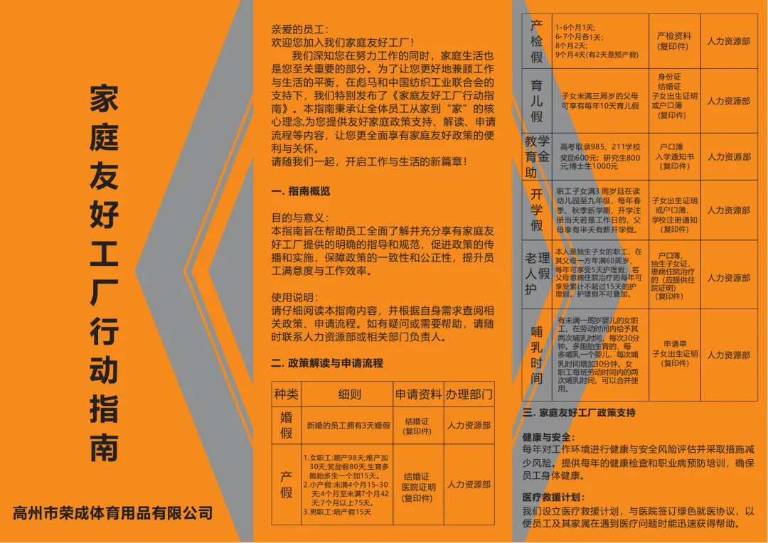 高州市榮成體育用品有限公司將企業(yè)每一位員工視為“家人”,致力于為“家人們”打造成一個(gè)溫馨和諧的大家庭。企業(yè)通過(guò)在員工家庭照顧支持、家庭關(guān)愛(ài)、性別平等方面開(kāi)展積極實(shí)踐,成功將家庭友好理念融入了管理,解決了員工最為憂心的“眼前事”,讓員工能夠更加積極、飽滿地投入工作,在企業(yè)與員工之間筑起了一座“連心橋”。
